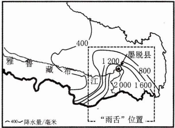 “雨舌”是指丰沛降水区域呈“舌头”状向某方向延伸的现象。我国的“雨舌”位于青藏高原东南部雅鲁藏布江大拐弯处。下图为我国“雨舌”位置示意图。读图,完成5~6题。