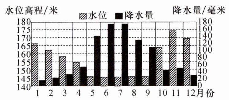 为充分发挥防洪、发电、航运、供水等多种功能并兼顾环境效益,三峡水库采取“蓄清排浑”的运行方式。“蓄清排浑”即汛期排出“浑水”(含沙量大的水),汛后蓄满“清水”(含沙量小的水)。图为三峡库区月平均降水量和三峡水库月平均水位高程图。据此完成11~13题。