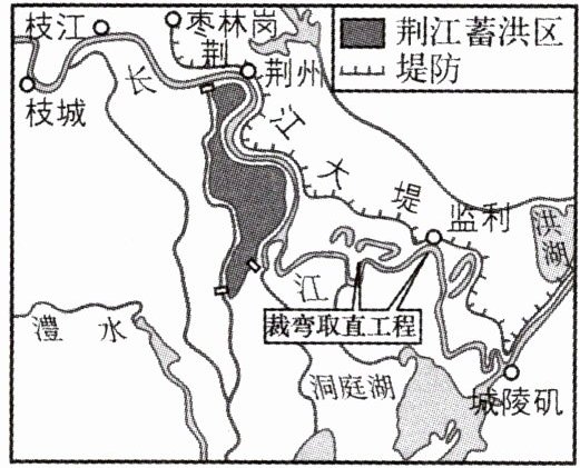 (枣庄中考)荆江是指从湖北枝城到湖南城陵矶河段,此处河道弯曲,水流不畅,易发生洪涝灾害。读图,完成9~10题。