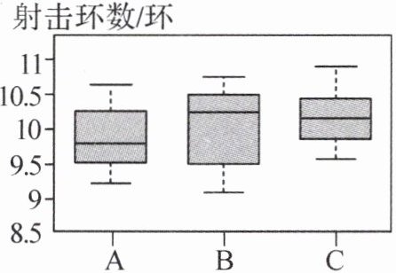 解:C选手的最高分高于A选手和B选手,中位数略低于B选手,高于A选手且C选手的成绩更集中,发挥更稳定;B选手的中位数最大,在10.3~10.5之间的成绩更集中,但同时也打出了所有选手的最低成绩,成绩波动很大;A选手的中位数最小,在9.55~9.8之间的成绩更集中,但整体发挥比B选手稳定一些,整体来看成绩最好的是C选手.