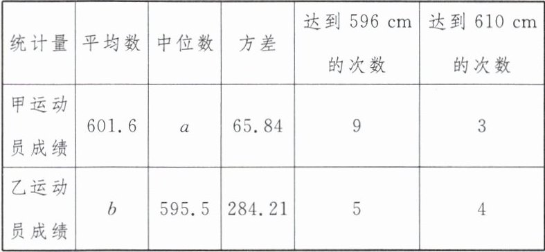 (2)甲10次成绩中有9次成绩达到596cm,而乙10次成绩中只有5次达到596cm,而且甲的成绩更稳定,