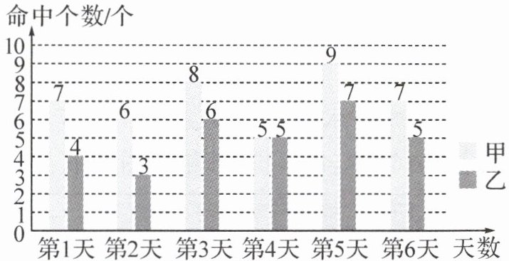 1. 甲、乙两名学生参加投篮训练,连续6天训练结束后,两人都会进行投篮比赛检验当天训练成果,每人投十个球,记录两人投篮命中的个数如下图: