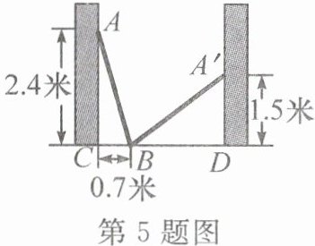 5. 如图,小巷左右两侧是竖直的墙,一架梯子斜靠在左墙时,梯子底端到左墙角的距离BC为0.7米,梯子顶端到地面的距离AC为2.4米。若保持梯子底端位置不动,将梯子斜靠在右墙,梯子顶端到地面的距离A'D为1.5米,则小巷的宽为(