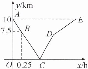 10. 小蕾家与外婆家相距270km,她假期去看望外婆,返回时,恰好有一辆顺风车可以带小蕾到A服务区,于是,小蕾与爸爸约定,她先搭乘顺风车到A服务区,爸爸驾车到A服务区接小蕾回家。两人在A服务区见面后,休息了一会儿,然后小蕾乘坐爸爸的车以60km/h的速度返回家中。在小蕾的整个行程中,小蕾与自己家的距离y(km)和时间x(h)之间的关系如图所示。