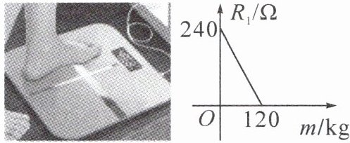 9. 新考向 跨学科 电子体重秤原理是利用力传感器在置物平台上放上重物后,使表面发生形变而引发了内置电阻的形状变化,电阻的形变必然引发电阻值的变化,电阻值的变化又使内部电流发生变化产生了相应的电信号,电信号经过处理后就成了可视数字。简易电子秤制作方法:制作一个装有踏板(踏板质量忽略不计)的可变电阻R₁,已知R₁与踏板上人的质量m之间的关系式为R₁ = km + b(其中k,b为常数,0 ≤ m ≤ 120),如图所示。下列说法不正确的是(