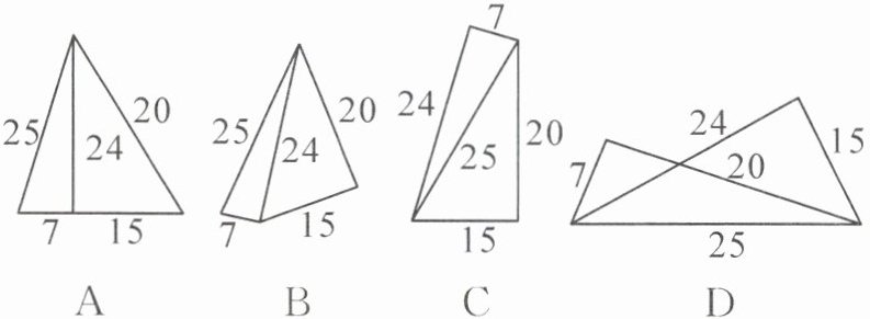 5. (教材 P14 随堂练习 T1 变式)有五根小木棒,其长度分别为 7,15,20,24,25,现将它们摆成两个直角三角形,其中正确的是(