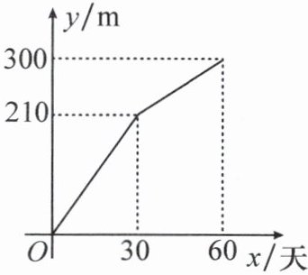 3. (2023·吉林)甲、乙两个工程组同时挖掘沈白高铁某段隧道,两组每天挖掘长度均保持不变。合作一段时间后,乙组因维修设备而停工,甲组单独完成了剩下的任务。甲、乙两组挖掘的长度之和 $ y $(m)与甲组挖掘时间 $ x $(天)之间的关系如图所示。