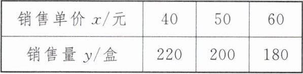 1. 某水果店推出的一款水果拼盘套餐受到了广大消费者的喜爱,每天的销售量 $ y $(盒)与销售单价 $ x $(元)之间存在一次函数关系(如下表所示)。已知该水果拼盘套餐的成本为 30 元/盒。