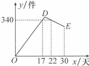 2. 某公司开发出一款新的节能产品,该产品的成本价为 6 元/件。该产品在正式投放市场前通过代销点进行了为期一个月(30 天)的试销售,售价为 8 元/件。工作人员对销售情况进行了跟踪记录,并将记录情况绘成图象(如图所示),图中的折线 $ ODE $ 表示日销售量 $ y $(件)与销售时间 $ x $(天)之间的函数关系。已知线段 $ DE $ 表示的函数关系中时间每增加 1 天,日销售量减少 5 件。