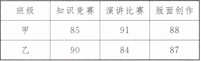 (2)如果将知识竞赛、演讲比赛、版面创作按 $ 5:3:2 $ 的比例确定最终成绩,请通过计算说明甲、乙两班谁将获胜。