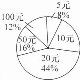 3. 在一次捐款活动中,某班 50 名同学都拿出自己的零花钱,有捐 5 元、10 元、20 元的,还有捐 50 元和 100 元的。如图所示的统计图反映了不同捐款数的人数比例,那么该班同学平均每人捐款(