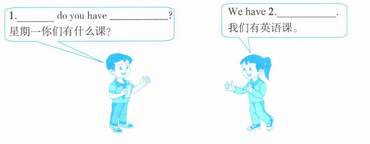今天星期一,下面的小朋友有什么课程?一起看看并补全对话吧!