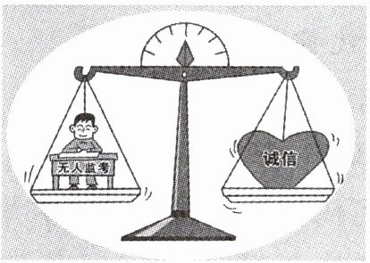 6.画面正中是一个天平,天平的左边是一个小男孩在无人监考的教室考试,右边是一个写有“诚信”二字的红色爱心。 学生参加无人监考的考试,要讲诚信。
