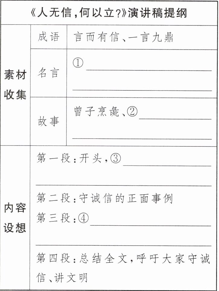 (2)①【示例】诚信为人之本。——鲁迅 ②【示例】季布一诺 ③【示例】引出观点 ④【示例】不守诚信的反面事例