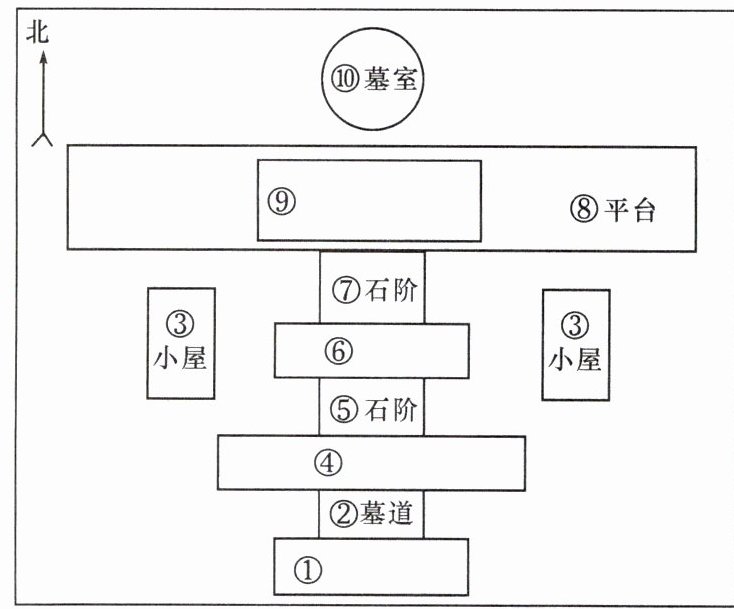①石碑坊 ④陵门 ⑥碑亭 ⑨祭殿(祭堂) 作者是按空间顺序由外而内、由总体到局部来说明的。解说:陵墓的入口位于最南端,是一座三间三楼琉璃瓦顶的石牌坊。石坊北是一条缓长的墓道,墓道正面是陵门,穿过陵门后的石阶就可以到达碑亭。自碑亭再北,地势陡然高峻,由此上石阶,石阶尽处是一个大平台,中央矗立着陵园的主体建筑——祭殿(祭堂)。祭堂后面便是高8.4米,直径13.7米的墓室。