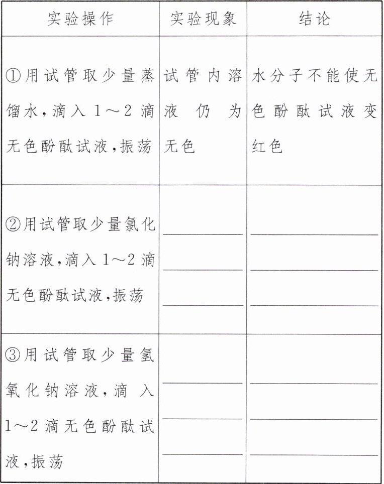【实验验证】试管内溶液仍为无色 Na⁺不能使无色酚酞试液变红色 试管内溶液变为红色 OH⁻能使无色酚酞试液变红色【讨论反思】无色酚酞试液本身就含有水分子,且氯化钠溶液中含有水,实验②能同时验证水和钠离子对无色酚酞试液变色的影响