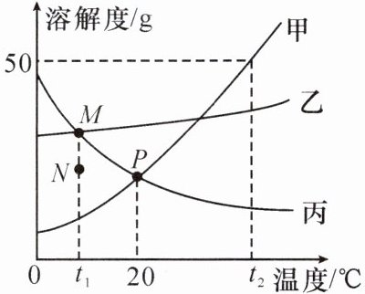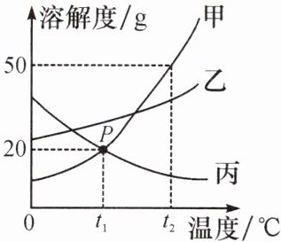)③ P点表示t₁℃时,甲和丙的饱和溶液中溶质质量相等。(