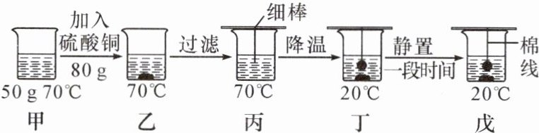 6. 在制备硫酸铜晶体时,小明在 50 g 的 70℃热水(图甲)中,加入 80 g 硫酸铜粉末后现象如图乙所示,后续过程如图。