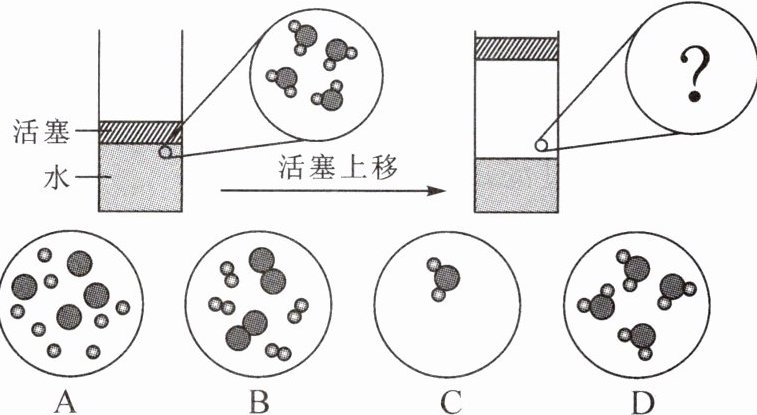 7. 提起压在容器中水面上方的活塞,容器中的水发生汽化,如图所示。下列选项中,最能表示水汽化后相同空间内粒子分布的是(