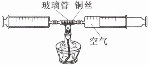 1. 在测定空气中氧气含量的实验中,小科采用了如图所示装置:在由两个注射器和玻璃管组成的密闭系统中留有 25 mL 空气,给装有细铜丝的玻璃管加热,交替缓慢移动两个注射器活塞,至玻璃管内的铜丝在较长时间内无进一步变化时停止加热,待冷却至室温,将气体全部推至一个注射器内,观察密闭系统内空气体积变化。