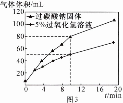 (填“1.41”或“9.1”)mL。(7) 依据如图3所示实验结果,小组同学决定选用过碳酸钠固体作为便携式供氧器的制氧剂,理由是: