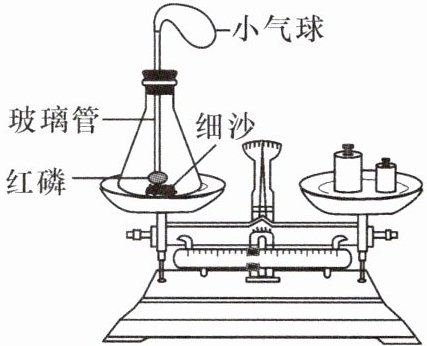 实验方法:如图所示,称量反应前装有红磷的锥形瓶和玻璃管的总质量为 $ m_{1} $,取下锥形瓶,将玻璃管下端在酒精灯火焰上灼烧至红热,迅速用橡皮塞将锥形瓶塞紧,引燃红磷。待锥形瓶冷却后,重新放到托盘上称量,称得总质量为 $ m_{2} $。