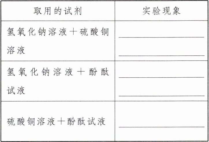 (1) 向试管中倒入少量氢氧化钠溶液,然后向其中滴加 1~2 滴硫酸铜溶液,振荡试管,观察现象。用同样的方法,分别向盛有少量氢氧化钠溶液和硫酸铜溶液的试管中滴加酚酞试液,观察现象。