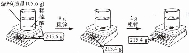 5. 某小组用粗锌测定某稀硫酸中溶质的质量分数,取一定质量的稀硫酸于烧杯中,称量稀硫酸和烧杯的总质量,然后往其中分两次加入粗锌(杂质不参加反应),实验过程和数据如图所示,请计算: