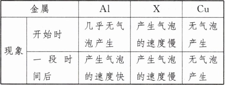 13. 小强同学分别取溶质质量分数相同的稀盐酸,大小、形状都相同的金属${X}$、${Al}$、${Cu}$进行实验,实验现象记录如下: