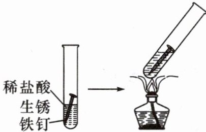 11. 如图所示,将表面生锈的铁钉放入盛有稀盐酸的试管中,一段时间后发现溶液变成浅黄色,将试管进行加热后发现溶液颜色立即加深,并产生大量气泡。根据以上现象判断,下列说法错误的是(