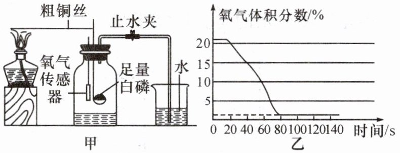 3. (2023·泉州期末)小明利用如图甲所示装置(气密性良好)和试剂测定空气中氧气含量,集气瓶中空气的体积为 200 mL,氧气传感器测得集气瓶内氧气的体积分数变化曲线如图乙所示。下列有关说法正确的是(