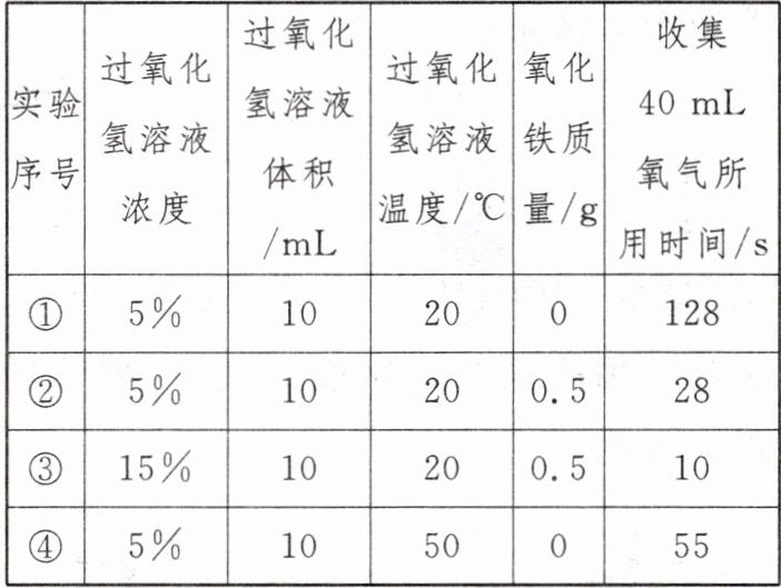 10. [科学探究与实践]为了探究氧化铁能否作过氧化氢溶液分解的催化剂,同学们设计了实验装置并进行了气体的制取和测量实验。实验时均以生成40mL气体为标准,相关实验数据记录如下表。