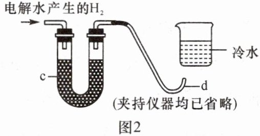 (4)科学家还用点燃氢气、通过证明燃烧产物的方法证实了水的组成。电解水产生的氢气中会混有水蒸气,首先将其缓缓地通过装有足量无水硫酸铜的仪器 c,在导管口 d 处点燃,然后把盛有冷水的烧杯置于如图 2 所示的位置。实验过程中可以观察到的现象是