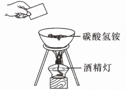 10. 取少量碳酸氢铵固体粉末放入蒸发皿中,将蒸发皿放在酒精灯上加热(如图所示)。