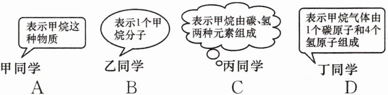 1. 天然气的主要成分是甲烷,其化学式为${CH_{4}}$。下列四位同学关于“${CH_{4}}$”意义的说法错误的是 (