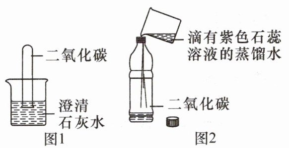 (2) 如图2所示,打开瓶盖,迅速将烧杯中滴有紫色石蕊溶液的蒸馏水倒入软塑料瓶中,立即拧紧瓶盖,振荡,出现的现象是紫色石蕊溶液变红、