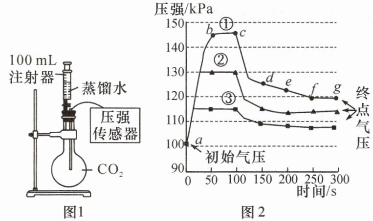9. (2024·泉州鲤城区月考)某小组利用图1装置研究25℃时二氧化碳的溶解性。打开止水夹,向3个充满二氧化碳的100mL烧瓶中,分别注入20mL、40mL、60mL蒸馏水,关闭止水夹,振荡前后压强的变化如图2。下列说法不正确的是(