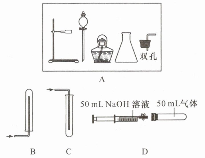 。(3) 如图D,收集一试管气体进行实验,打开止水夹,向试管中注入少量${NaOH}$溶液,充分振荡后,注射器活塞最终停留在8mL刻度处。