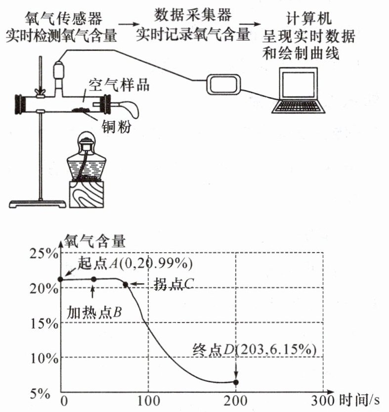14. [数字化实验](2024·吉林)为探究铜的化学性质,某同学借助氧气传感器在密闭装置中进行如图所示实验,观察实验现象并分析氧气含量随时间变化的曲线图。其中终点D(203,6.15%)表示时间为203s时,装置中氧气含量为6.15%。结合图示判断下列说法错误的是(
