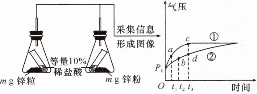 11. (2024·福州模拟)如图所示,倾斜锥形瓶使试管内的稀盐酸流入瓶中与固体发生反应,利用数字化设备采集瓶内气压,瓶内气压与时间关系如曲线所示。下列有关说法正确的是(