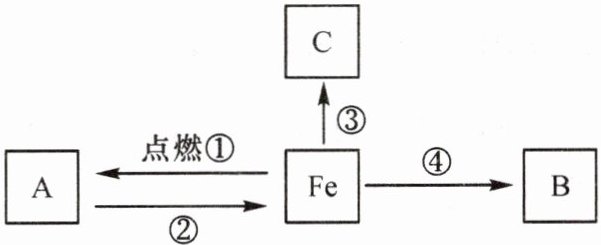 12. 构建知识网络是一种重要的学习方法。下图是关于铁的化学性质的知识网络图(“→”表示一种物质转化为另一种物质),其中B是密度最小的气体,C为红色固体单质。请回答下列问题: