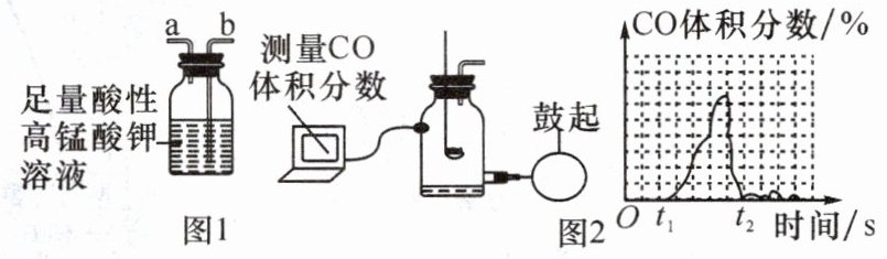 。(3) 小组同学通过一定手段,测得焚烧垃圾产生的气体中 $ {CO} $ 体积分数变化如图 2,$ t_{1} \sim t_{2} $ 时间段内 $ {CO} $ 体积分数出现异常的原因是