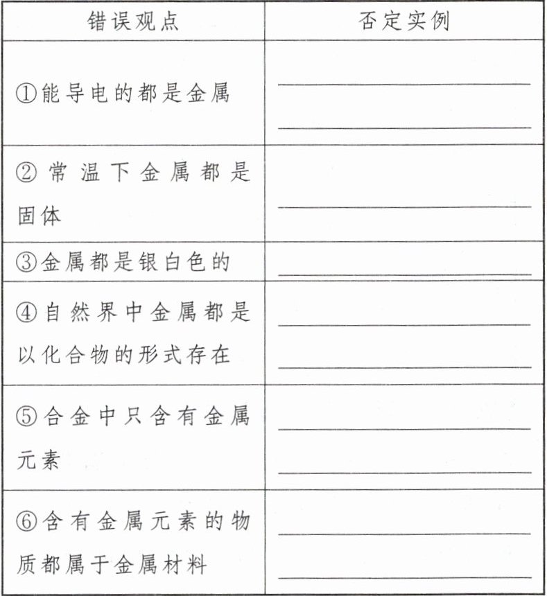 1. 学习了金属和合金后,下表是几位同学对金属和合金的错误理解,请你用熟悉的实例来否定其观点。