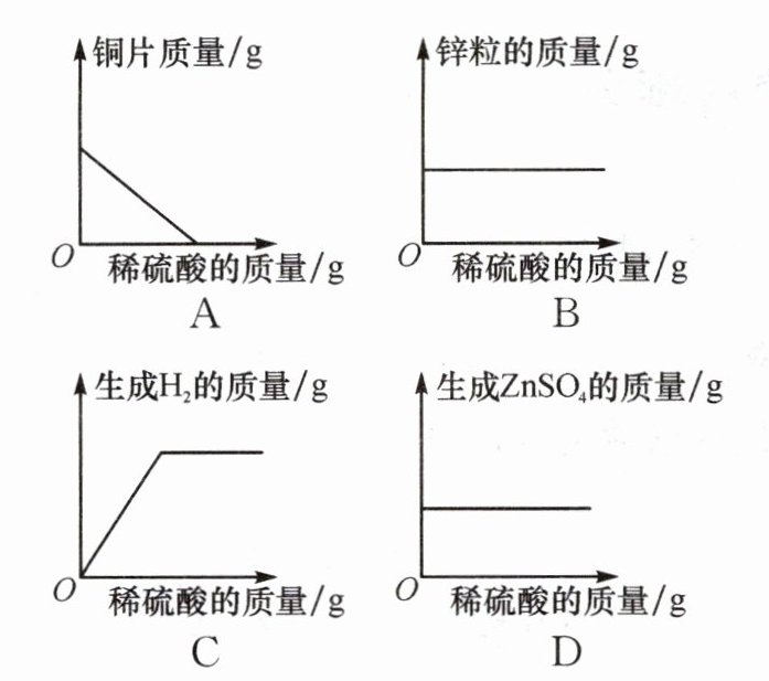 3. 取一定质量的锌粒和铜片于同一敞口容器中,再逐渐加入稀硫酸。下列加入稀硫酸的质量与有关量的变化的关系图正确的是(
