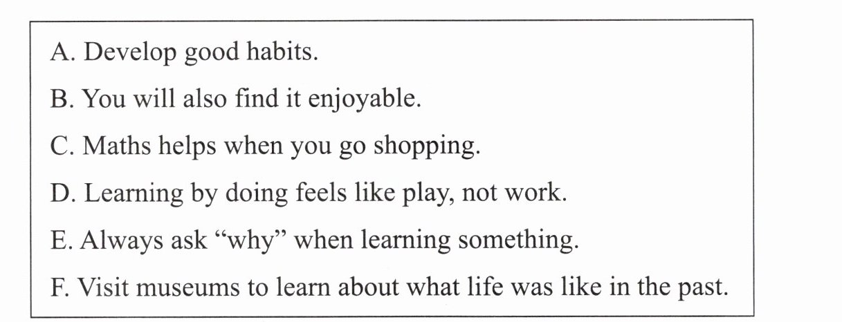 1.E 由小标题“Ask questions.”可知,此处强调在学习中提问的重要性。E项“学习时,要常问‘为什么’”符合语境。故选E。