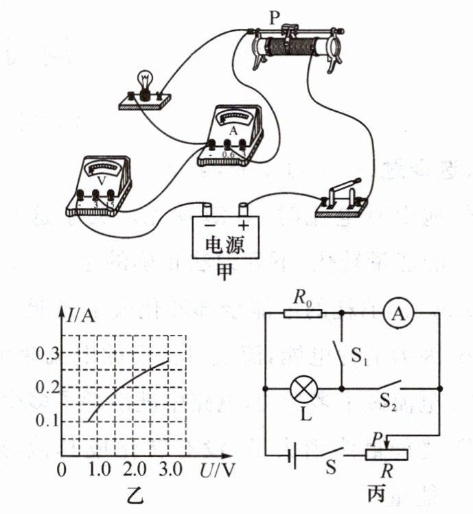 (4) 同组的小月同学设计了图丙所示的电路,也测出了该小灯泡的额定电功率$(R_{0}$为阻值25Ω的定值电阻,R为滑动变阻器)。