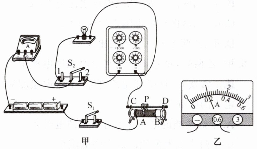 (1) 闭合开关$S_{1},$将开关$S_{2}$扳向(填“1”或“2”),调节滑动变阻器使电流表的示数如图乙所示,此时电流$I_{1}=$A。