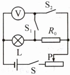 ②步骤②中,只闭合S、S2时,L断路,R0与滑动变阻器串联,电压表测R0两端电压为U,电路电流$I'=\frac{U}{R_0}$。
