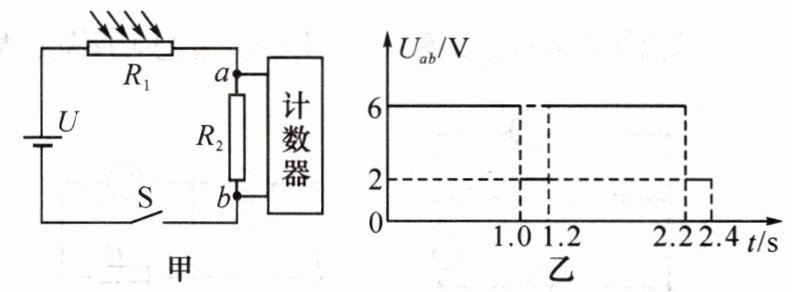 (1)当有光照射时,$R_{1}$电阻较小,两端电压较小,$R_{2}$两端电压较大,由图乙可知,$R_{2}$两端电压$U_{ab}=6V$