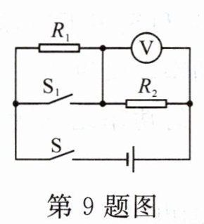 9. 如图所示,电源电压不变,开关S闭合,S₁由闭合到断开时,电压表的示数由12 V变为8 V,定值电阻R₁与R₂的阻值之比为